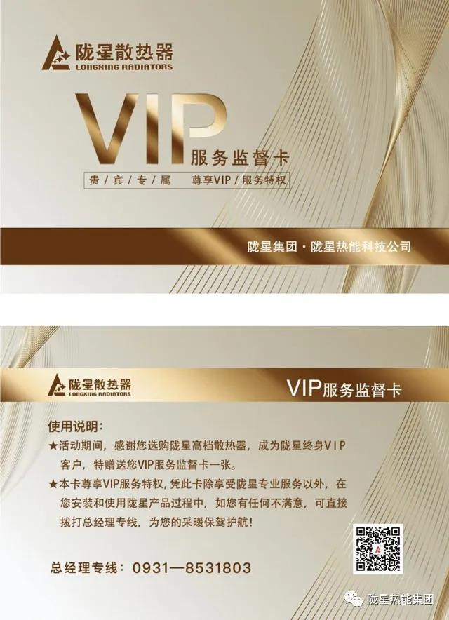 4月活動期間,凡購買隴星暖氣片的顧客,還可獲贈隴星VIP服務卡一張,貴賓專屬,尊享特權(quán),為您的愛家采暖保駕護航!