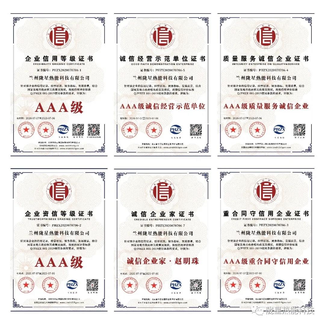 7月7日,北京華普正信國際信用評價有限公司和全國企業(yè)誠信公共服務(wù)平臺結(jié)合國家及地方相關(guān)政策及現(xiàn)狀,按照信用評價相關(guān)標(biāo)準(zhǔn),蘭州隴星熱能科技有限公司通過AAA級企業(yè)信用等級、AAA級企業(yè)資信等級、AAA級誠信供應(yīng)商、AAA級重合同守信用企業(yè)、AAA級誠信經(jīng)營示范單位、AAA級質(zhì)量服務(wù)誠信企業(yè)的評級認(rèn)定,趙明珠總經(jīng)理被評為誠信企業(yè)家,所有評價信息均已在中國招投標(biāo)網(wǎng)和全國企業(yè)誠信公共服務(wù)平臺進行公示。
