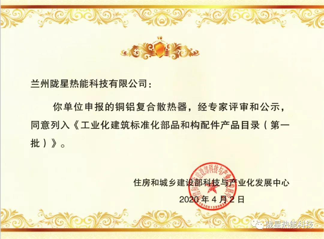 除此之外,隴星7月也是一路乘風(fēng)破浪,載譽前行。根據(jù)《國務(wù)院辦公廳關(guān)于大力發(fā)展裝配式建筑的指導(dǎo)意見》(國辦發(fā)〔2016〕71 號)文件精神和《工業(yè)化建筑標(biāo)準(zhǔn)化部品和構(gòu)配件應(yīng)用指南》相關(guān)要求。隴星熱能科技公司于今年5月提交有關(guān)申報材料,經(jīng)住房和城鄉(xiāng)建設(shè)部科技與產(chǎn)業(yè)化發(fā)展中心組織專家評審,隴星熱能科技公司銅鋁復(fù)合散熱器被列入《工業(yè)化建筑標(biāo)準(zhǔn)化部品和構(gòu)配件產(chǎn)品目錄(第一批)》。